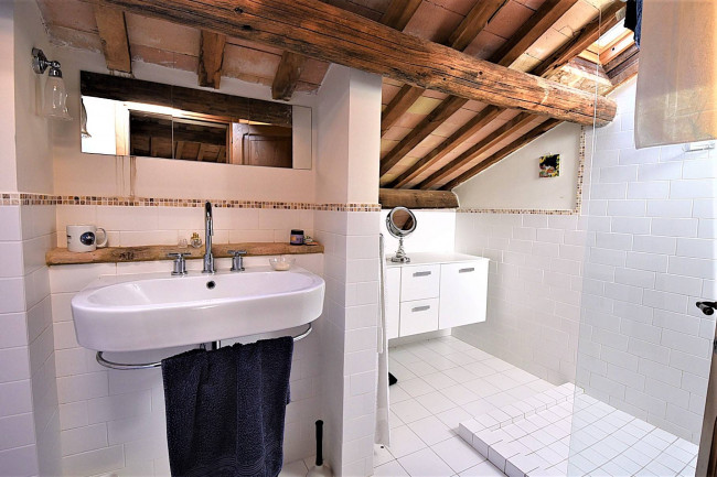A casa desenvolve-se por três pisos, com ambientes luminosos, acabamentos de qualidade e materiais originais recuperados, como pedra à vista, vigas em madeira e telhas tradicionais.